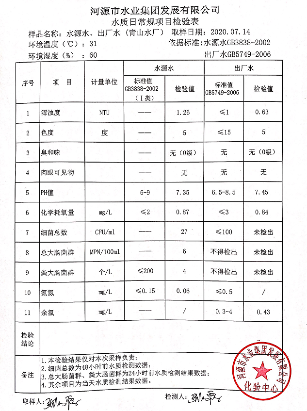 2020年7月14日水質(zhì)檢驗(yàn)報(bào)告