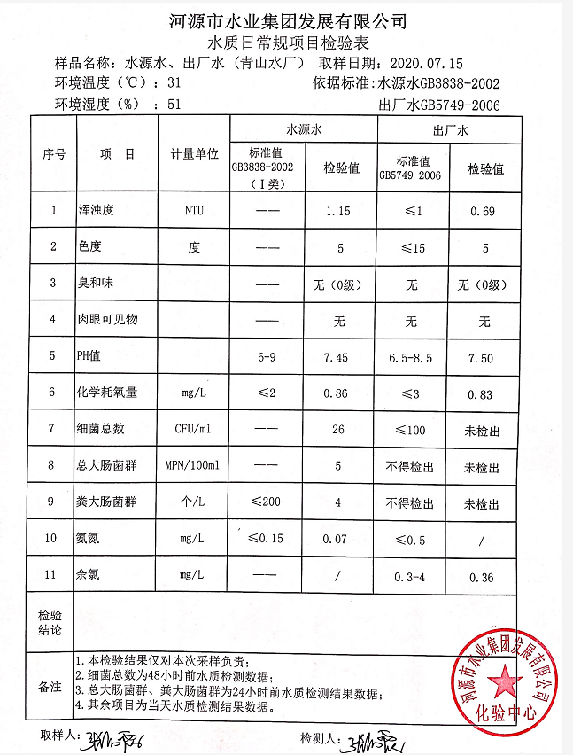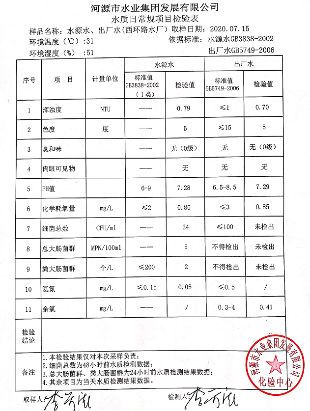 2020年7月15日水質(zhì)檢驗報告