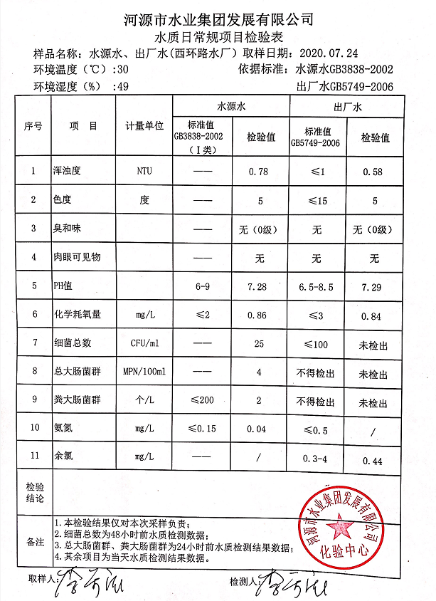 2020年7月24日水質(zhì)檢驗(yàn)報告
