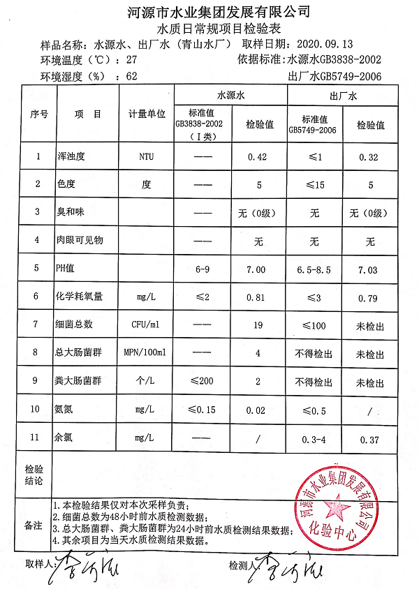 2020年9月13日水質(zhì)檢驗(yàn)報告