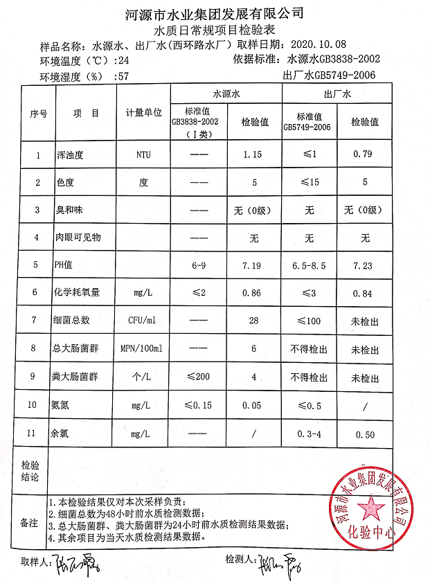 2020年10月8日水質(zhì)檢驗報告
