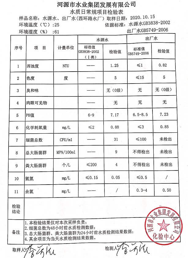 2020年10月15日水質(zhì)檢驗(yàn)報(bào)告