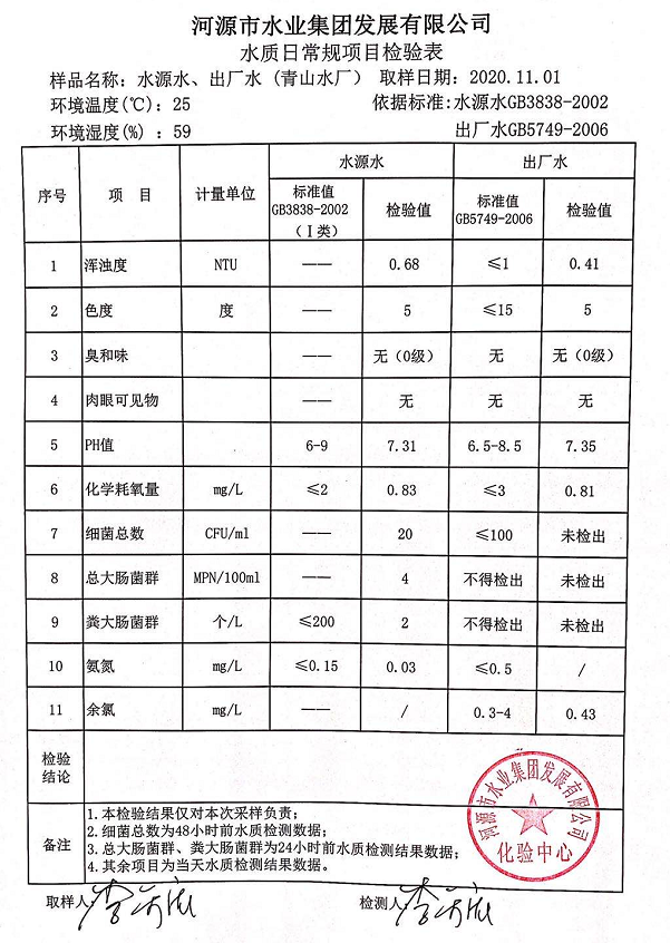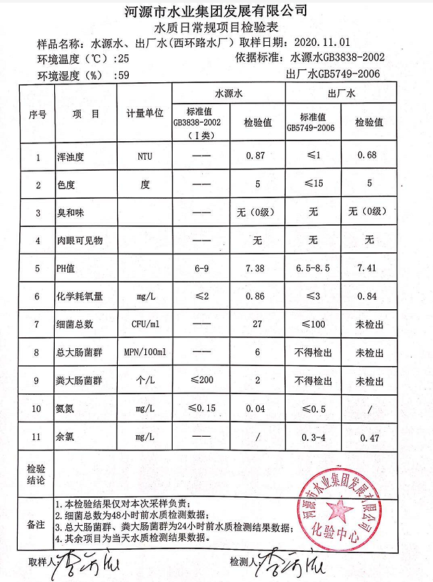 2020年11月1日水質(zhì)檢驗報告