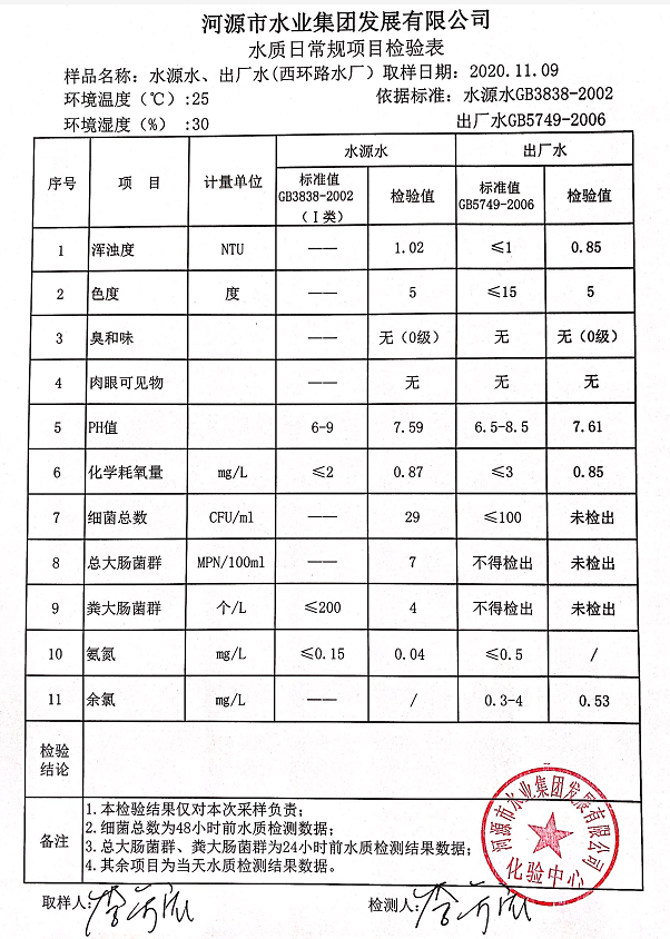 2020年11月9日水質(zhì)檢驗(yàn)報(bào)告