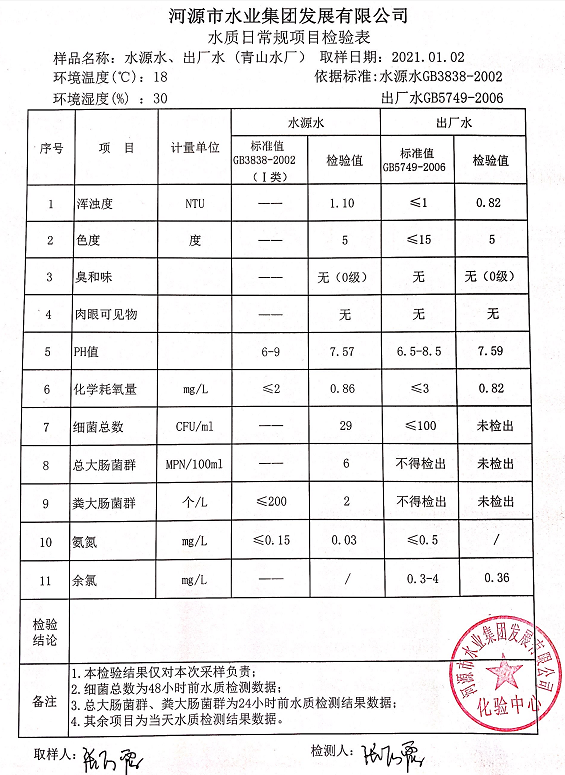 2021年1月2日水質(zhì)檢驗(yàn)報(bào)告