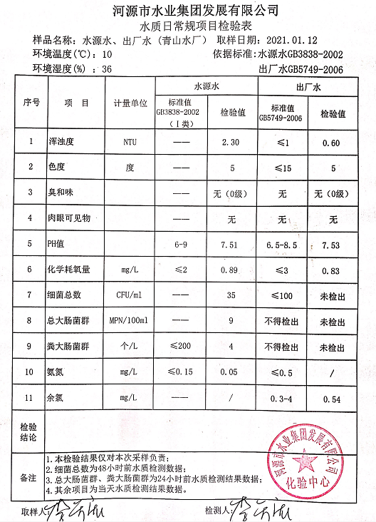 2021年1月12日水質(zhì)檢驗(yàn)報(bào)告