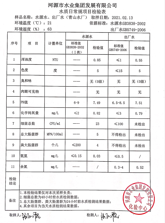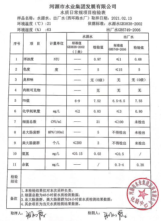 2021年2月13日水質(zhì)檢驗報告