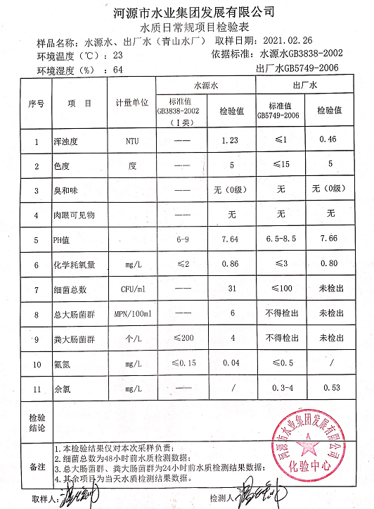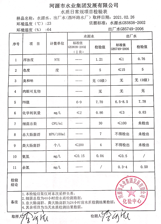 2021年2月26日水質(zhì)檢驗(yàn)報(bào)告