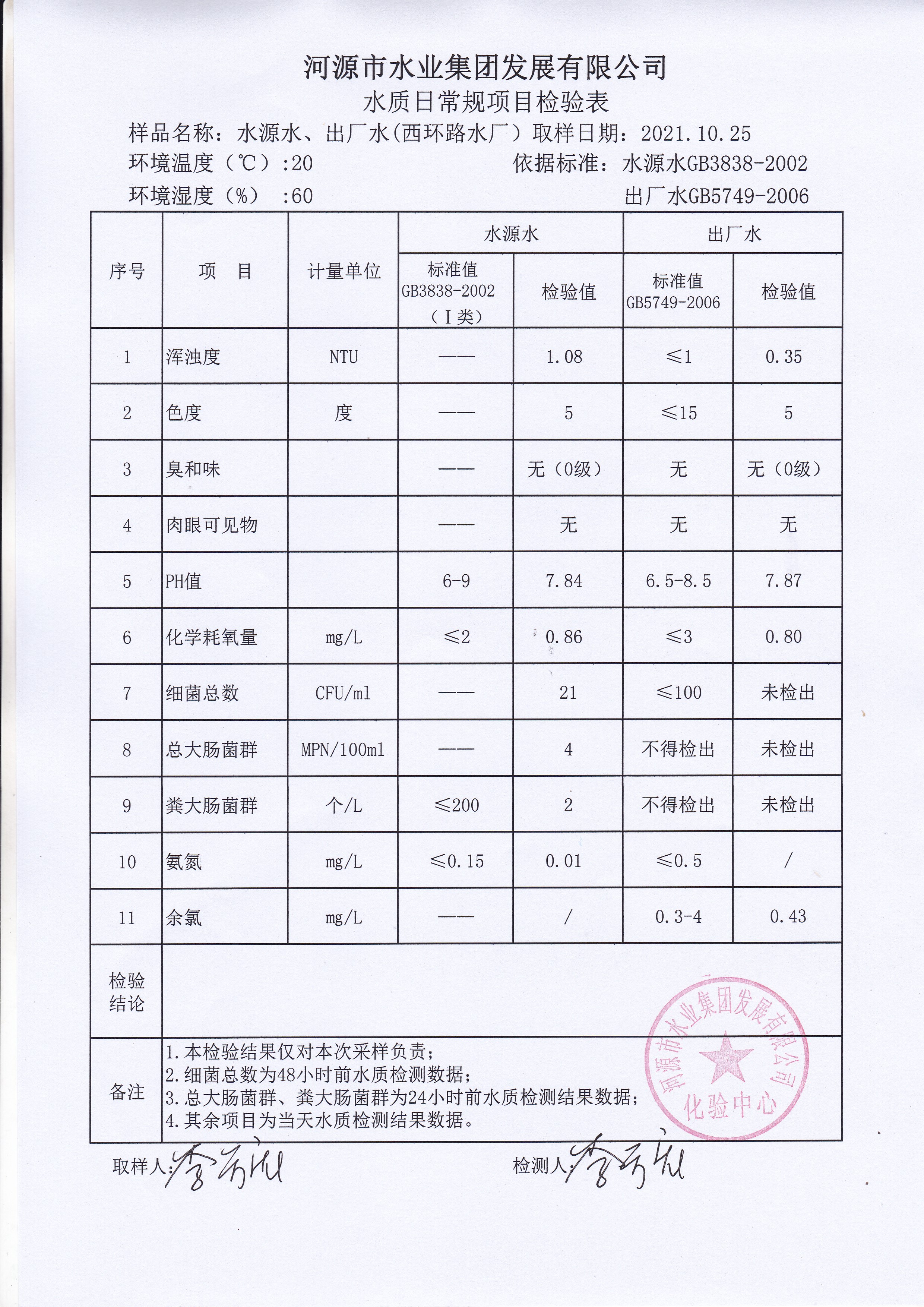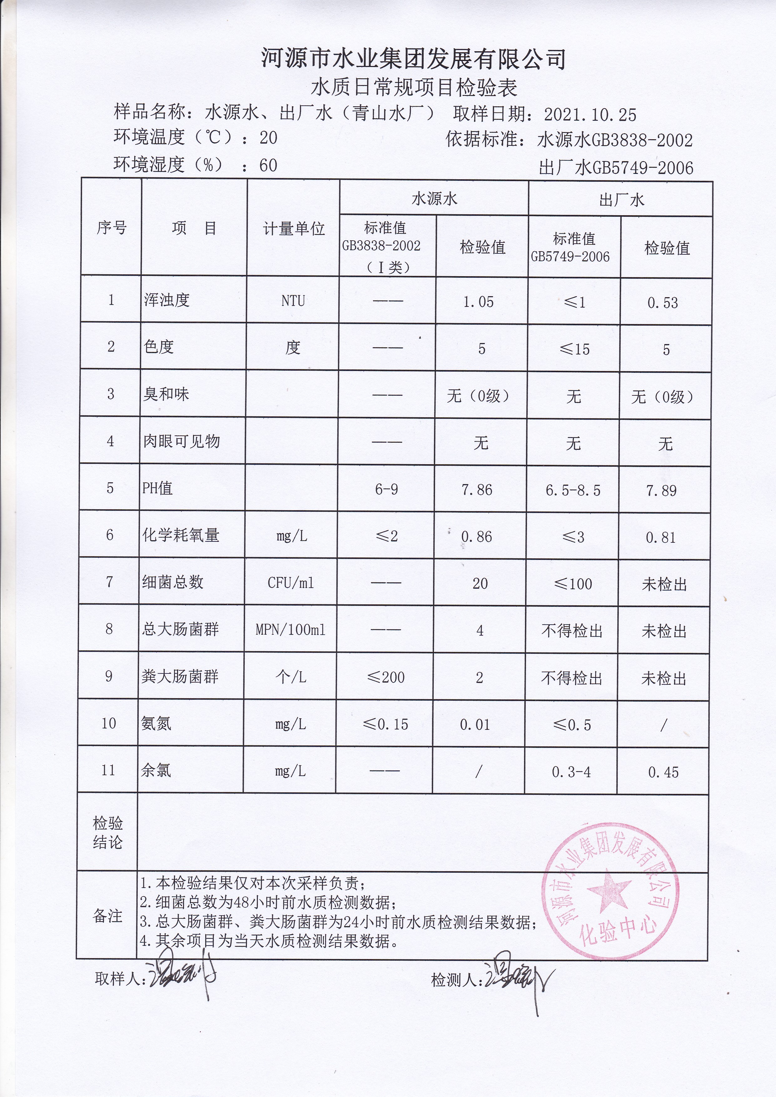 2021年10月25日水質(zhì)檢驗(yàn)報(bào)告