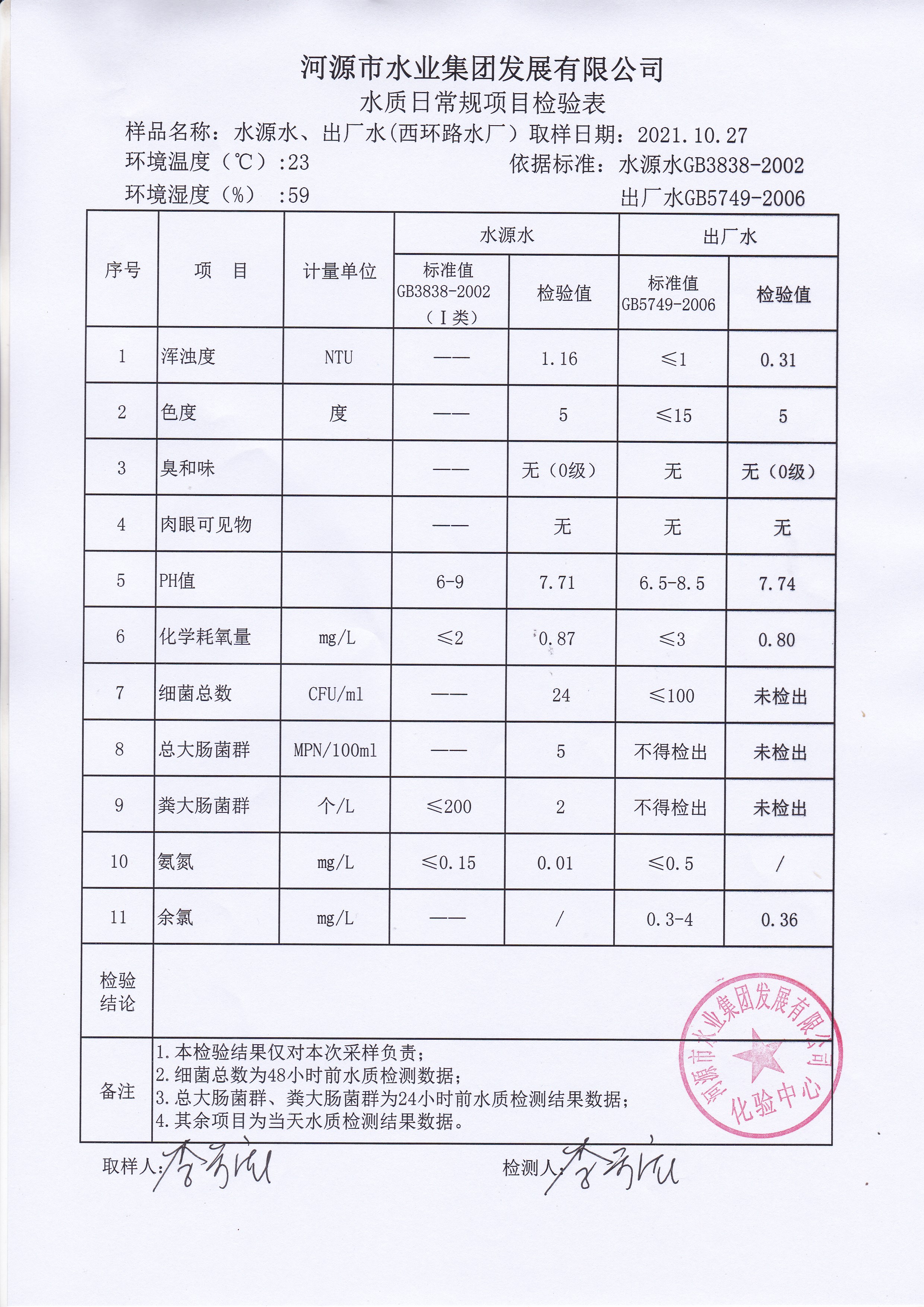 2021年10月27日水質(zhì)檢驗(yàn)報(bào)告