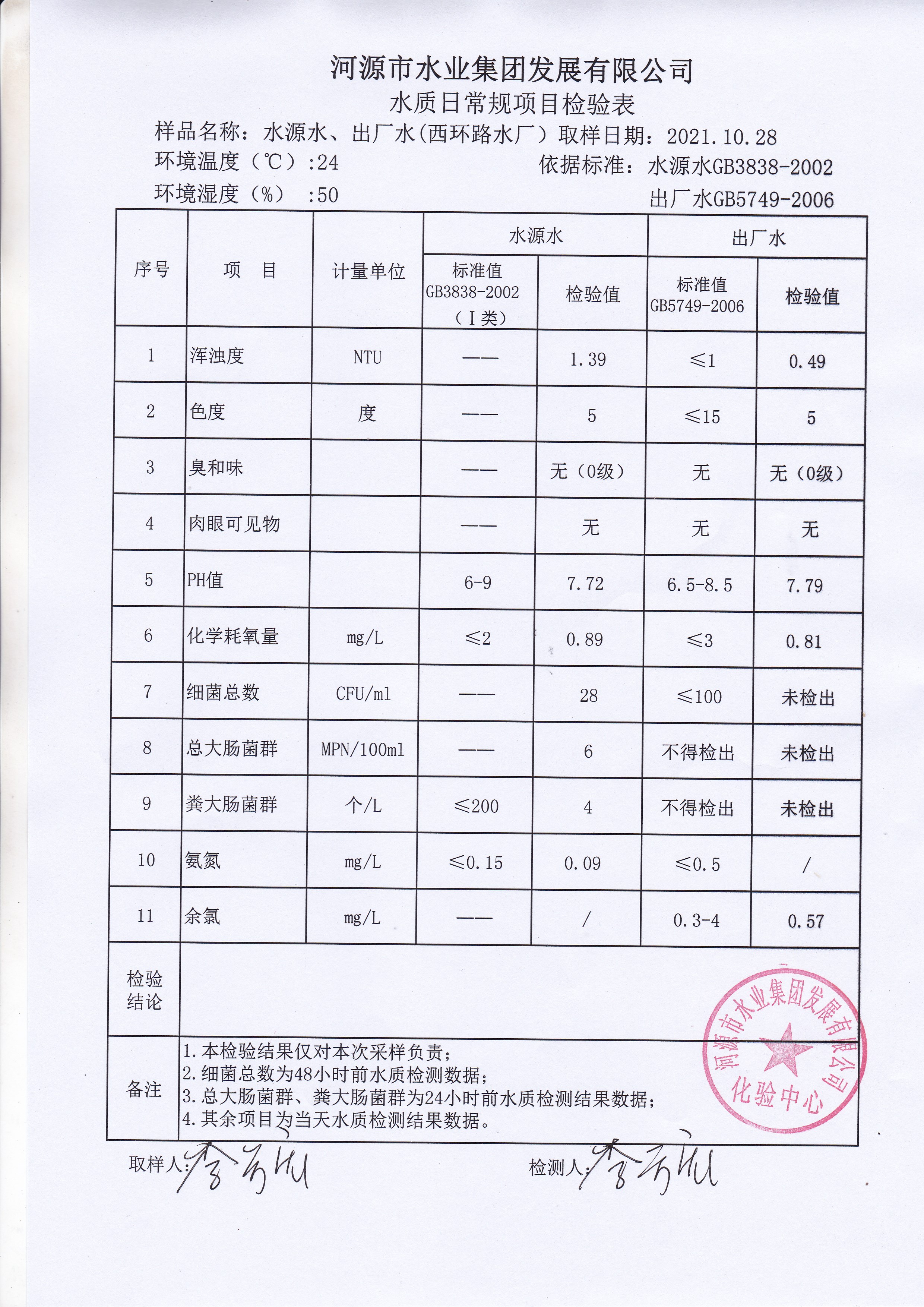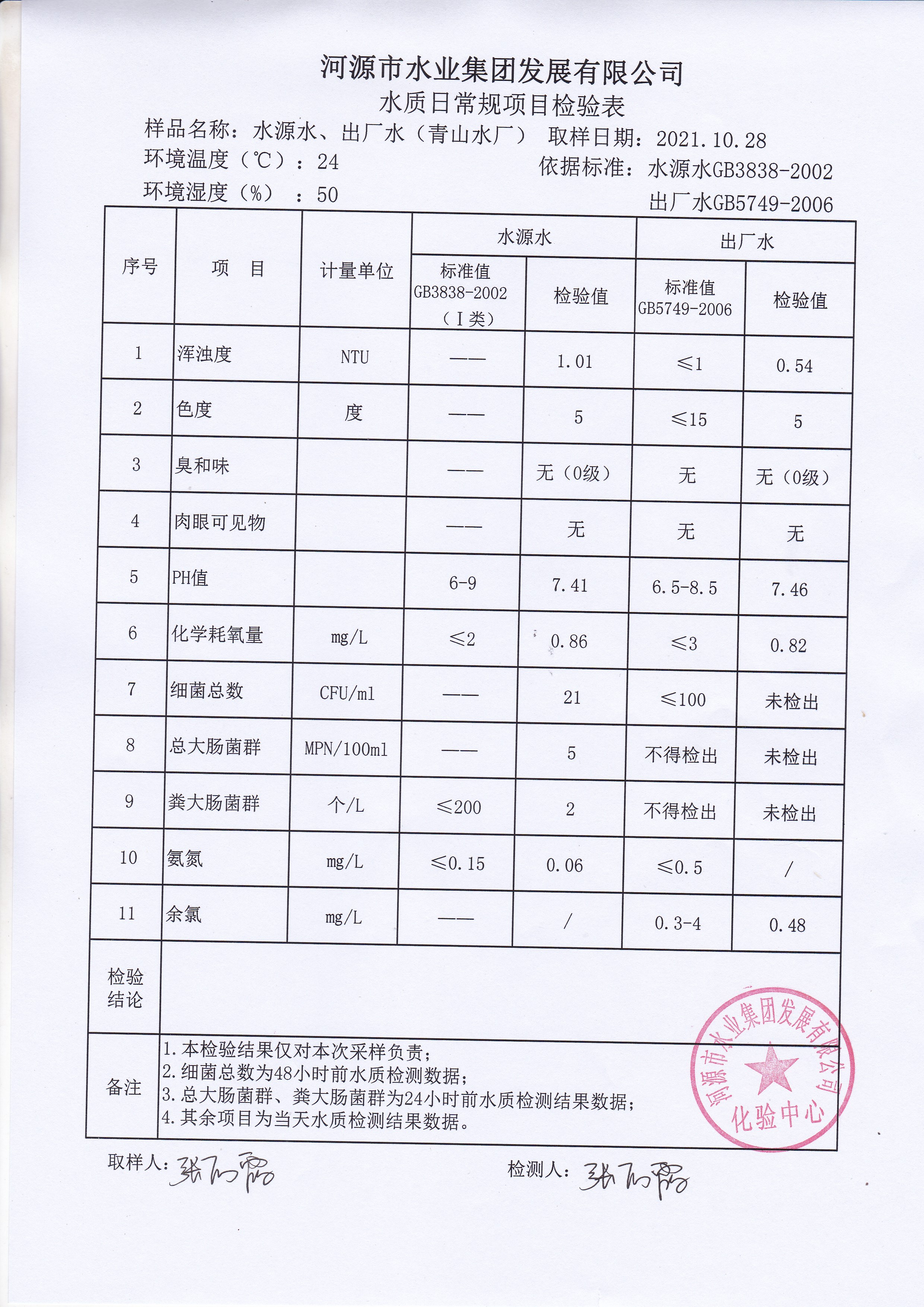 2021年10月28日水質(zhì)檢驗(yàn)報(bào)告