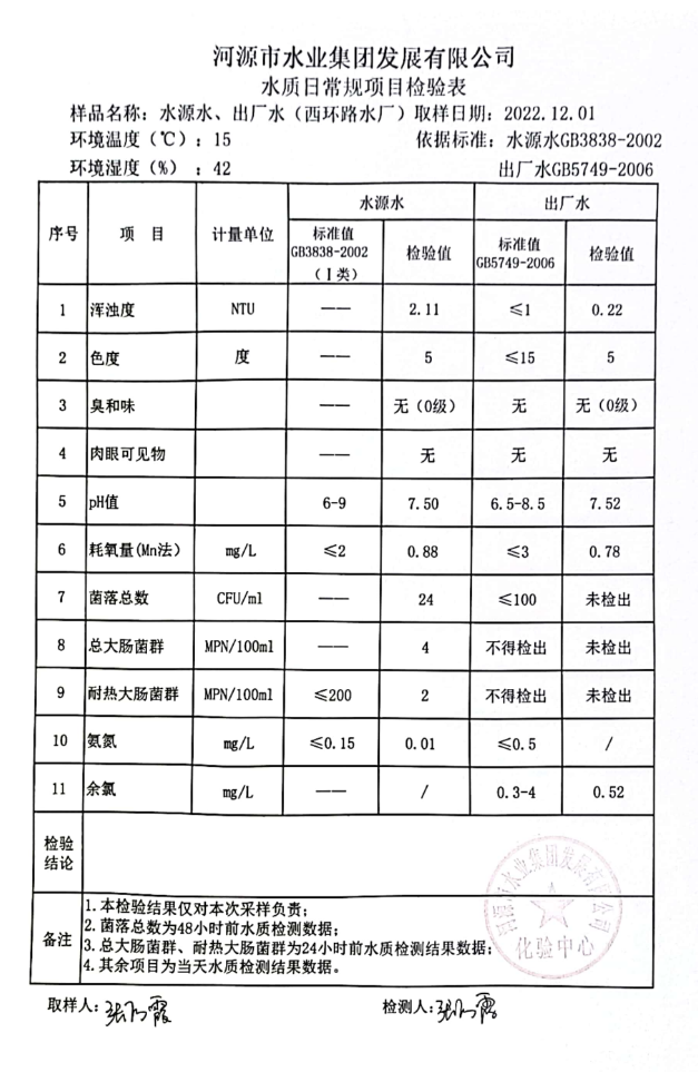 2022年12月1日水質(zhì)檢驗報告