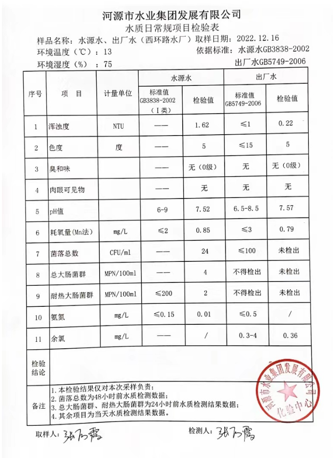 2022年12月16日水質(zhì)檢驗(yàn)報(bào)告