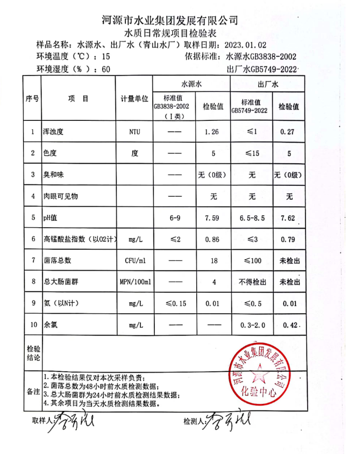 2023年1月2日水質(zhì)檢驗(yàn)報(bào)告