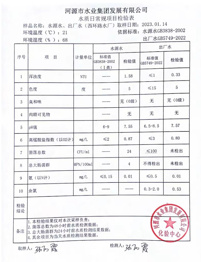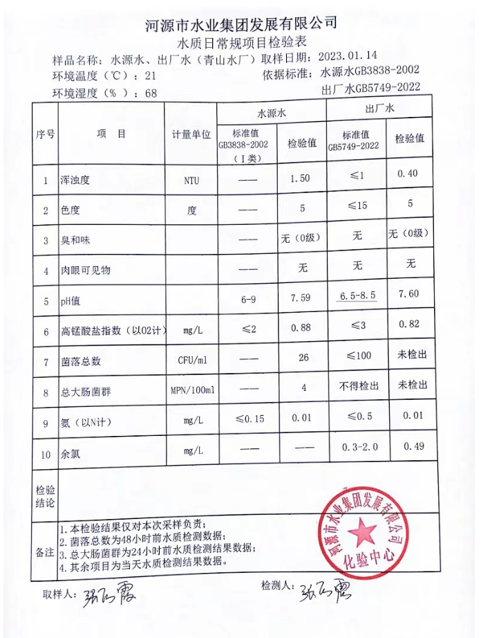2023年1月14日水質(zhì)檢驗(yàn)報(bào)告